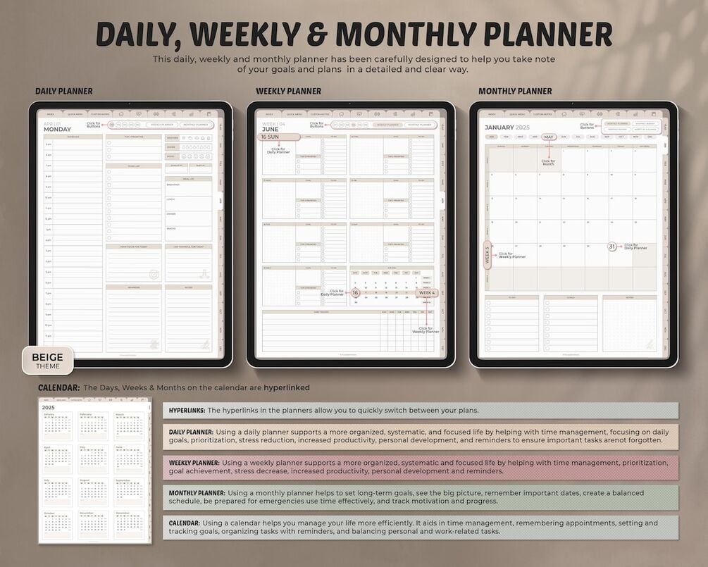 Introducing the All-in-One 2025 Digital Planner, designed for ultimate productivity and organization. Available in a soothing beige theme, this versatile planner is compatible with iPads and tablets using apps like Goodnotes, Notability, and Noteshelf.
